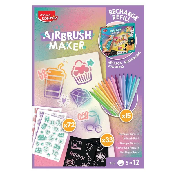 Recharge pour Airbrush composé de 15 feutres, 33 pochoirs et 72 stickers – thème Pastel