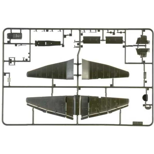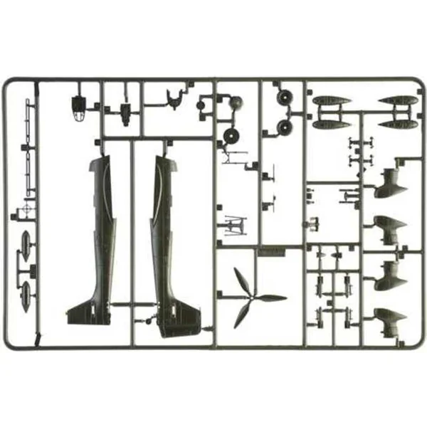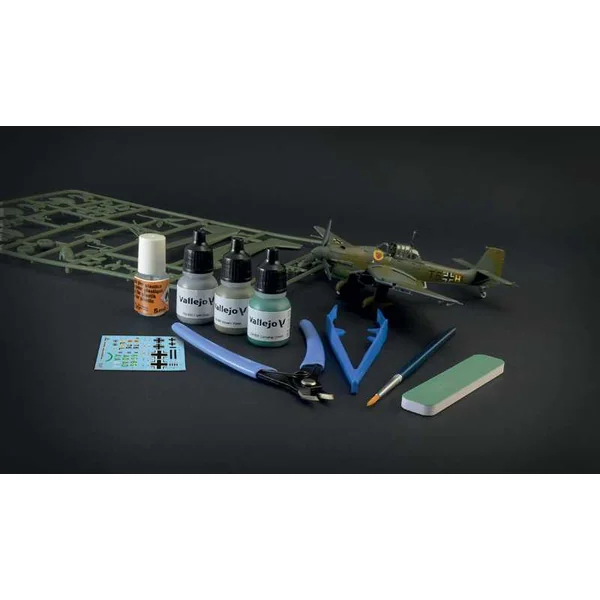Modèle d’avion à assembler. Taille : 1:72. L’emballage contient des peintures, un pinceau, de la colle liquide, des décalcomanies, une pince à épiler, une lime et des ciseaux.