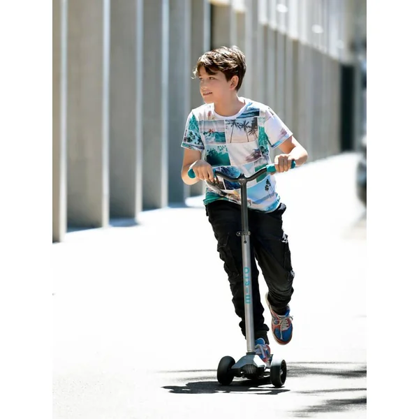 La trottinette 3 roues Maxi Micro Deluxe Pro Bleu/Gris ! La trottinette 3 roues Maxi Micro Deluxe Pro est l’évolution de la Maxi Micro. Idéale pour les enfants de 5 à 12 ans, grâce à son guidon ajustable en hauteur de 66 à 85 cm, elle s’adaptera au millimètre près à la taille de l’enfant. Elle offre un équilibre et une stabilité hors pair, grâce à ses nouvelles roues larges avant et arrière. De plus, le guidon type chopper permet un confort de conduite inégalé. Tout comme la Mini Micro, elle est dotée du système de navigation par transfert de poids intuitif, l’enfant devra se pencher à droite ou à gauche pour se diriger. Ce système de navigation inventé par Micro permet de travailler l’équilibre et la coordination. Outre son look unique, cette trottinette se distingue par la qualité de ses matériaux : sa planche en silicone offre une meilleure adhérence et ses réflecteurs de lumières à l’arrière garantissent une grande visibilité. La trottinette Maxi Micro Deluxe Pro sera le compagnon idéal de votre enfant pour longtemps grâce à son guidon réglable en hauteur.
