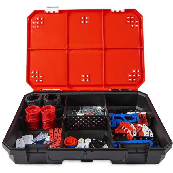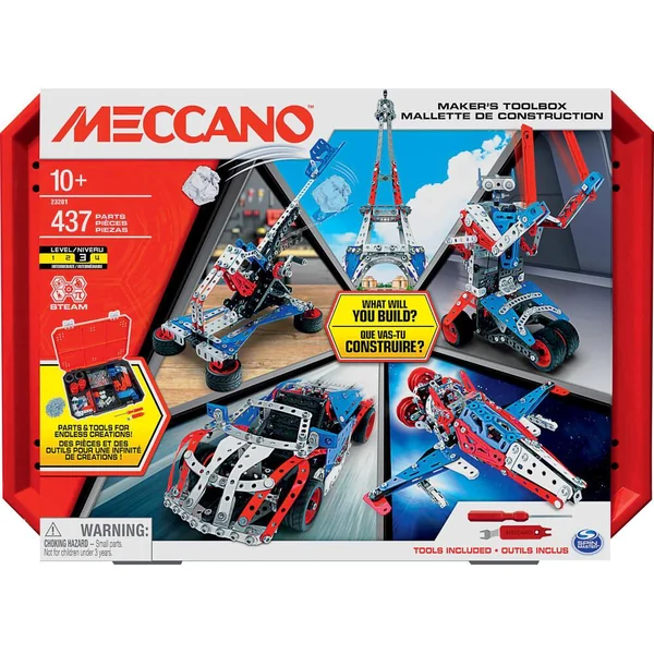 Compatible avec l’ensemble des pièces métal Meccano. Utilise ton imagination pour réaliser tes propres créations ! Malette compacte avec espaces de rangement et facile à transporter. 437 pièces, 2 outils, 1 boîte de rangement et notice de montage inclus.