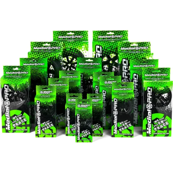 Roues complètes Medial Pro 2.2″ Tracer avec jante Titan pour modèles réduits de voitures RC. La jante est de couleur noire, la dureté du mélange de pneus est douce.