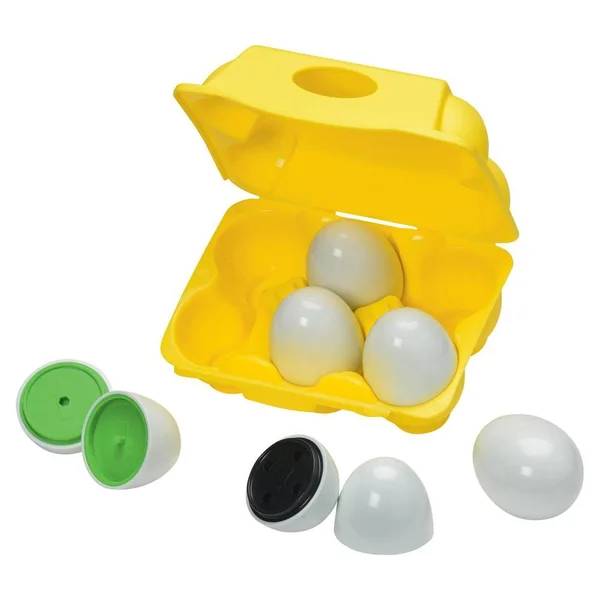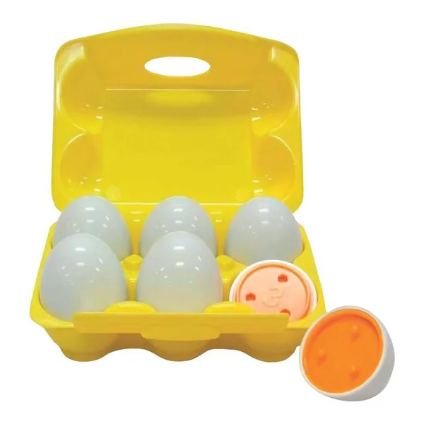 Pour apprendre les chiffres de 1 à 6. 6 œufs blancs rangés dans une boîte à œufs réaliste. Chaque œuf en plastique est en 2 pièces. Il a en son cœur une couleur, un chiffre, un nombre de tenons et de trous correspondant. L’enfant apprend à compter en jouant, triant et en assortissant les œufs. Facile à manipuler. En plastique. Développement de la coordination main-œil.
