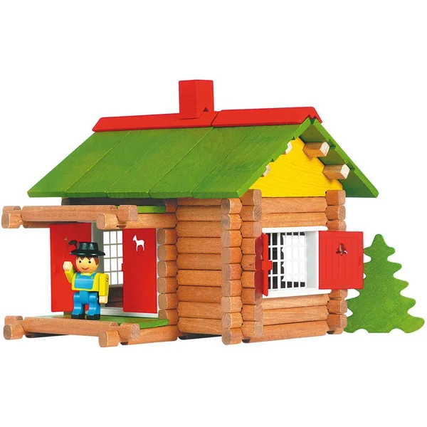 Mon Chalet en Bois – 100 pièces : jeu de construction en bois naturel et teinté avec une notice de montage, valisette carton : 26 x 24 x 9 cm