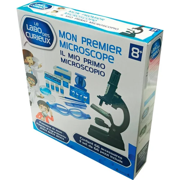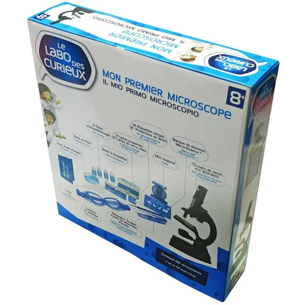 Microscope au corps en métal de 21.9 cm. 3 zooms intégrés au microscope. Puissance de zoom : 200X, 600X, 1200X. Contient 66 accessoires dont : 3 lentilles d’objectifs 10X-30X-60X, 1 oculaire zoom 10X-20X, 1 banque de données micro-science, 1 mini couperet, 14 étiquettes vierges, 12 protections de lames, 2 lames préparées, 10 lames de verre vides, 1 boîte à incubation, 4 fioles d’échantillonnage, 1 boîte de Pétri, 1 loupe, 1 mélangeur, 1 scalpel, 1 aiguille de dissection, pincette, 1 paire de lunettes en plastique et un mode d’emploi. 2 piles boutons (LR41) fournies. Pour faire de nombreuses expériences, découvrir et comprendre le monde qui nous entoure. Coloris : noir.