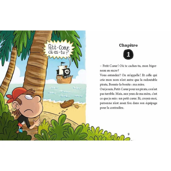 – Petit-Cœur ! Où te caches-tu, mon bigorneau en sucre ?Vous entendez ? On m’appelle ! Et celle qui crie mon nom n’est autre que la redoutable pirate, Bonnie-la-bonite : ma mère.Oui je sais, Petit-Cœur pour un pirate, ce n’est pas terrible. Mais, aux yeux de ma mère, c’est ce que je suis : un petit cœur. Et, croyez-moi, personne n’est assez fou dans son équipage pour la contredire.Mais voilà, j’en ai assez d’être la mascotte de La coquille de noix, son trois-mâts. Je veux prouver que je suis un vrai pirate, moi aussi. Pas un simple porte-bonheur… Et pour cela, c’est évident, je dois trouver un trésor. Comme celui caché sur cette île…Tu m’aides à le chercher ?