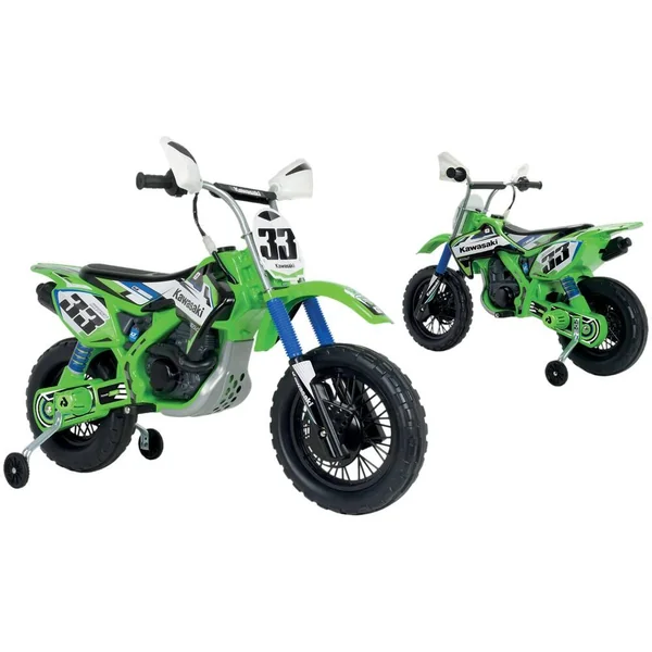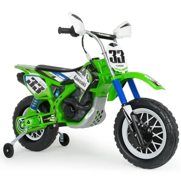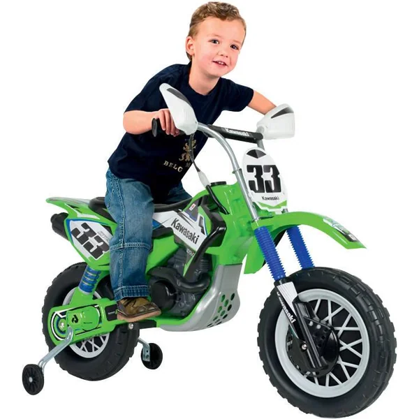Moto de cross électrique 12V. Licence Kawasaki. Marche avant. Accélérateur à la poignée comme sur une vraie moto. Vitesse : 5-6 km/h. Type de frein : électrique. Le frein s’active automatiquement quand l’accélérateur est relâché. Châssis renforcé. Hauteur de l’assise : 52 cm. Poids maximum recommandé : 50 kg. Roues en plastique, non gonflables. Avec bande de roulement en gomme (PVC) sur la roue arrière pour plus d’adhérence. Roulettes stabilisatrices incluses. Batterie 12V et chargeur inclus. Poids de la moto : 11.2 kg. En plastique et métal.