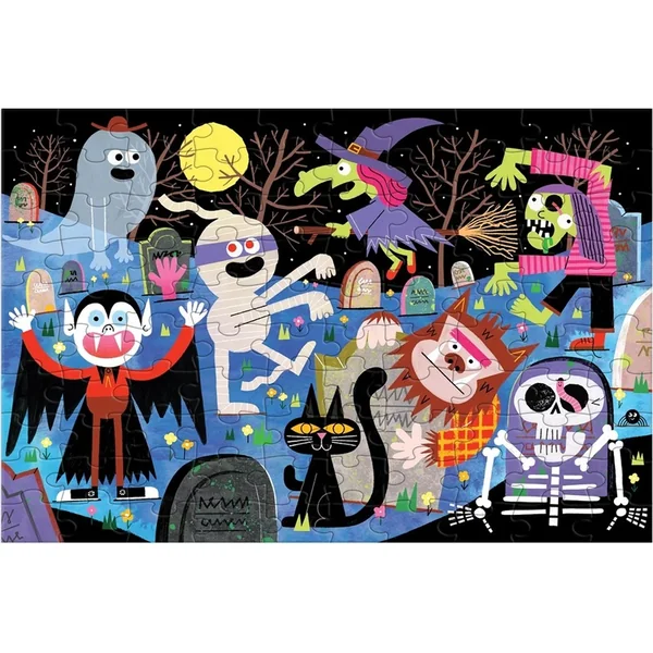 Aimez-vous les monstres ? Le puzzle Cimetière Hanté contient toutes les créatures effrayantes d’Halloween, comme des sorcières, des vampires, des fantômes et des momies.