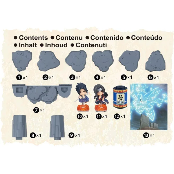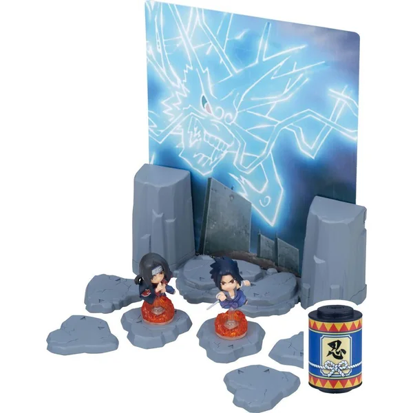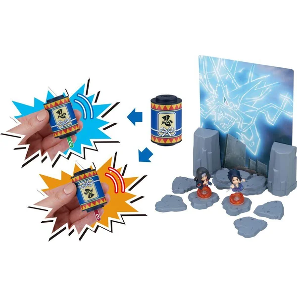 Entre dans l’aventure de Naruto ! Recrée la bataille épique entre Sasuke et son frère Itachi. 2 figurines ninja incluses pour un diorama ultra fidèle à l’animé. Ce n’est pas seulement un diorama mais aussi un jeu : secouez le parchemin pour avancer et ombattez votre adversaire