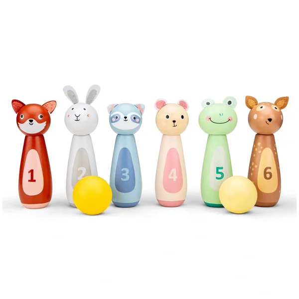 The animal friends bowling set features six uniquely designed animal pins, each representing a different character: a fox, rabbit, raccoon, bear, frog, and deer. Each pin is numbered from 1 to 6, which serves as a fun and interactive way for children to learn counting while they play. Measuring approximately 14 cm tall, these pins are perfectly sized for little hands, ensuring that your child can easily set them up and knock them down. The set also includes two yellow balls with a diameter of 5 cm, designed for easy rolling and maximum fun.