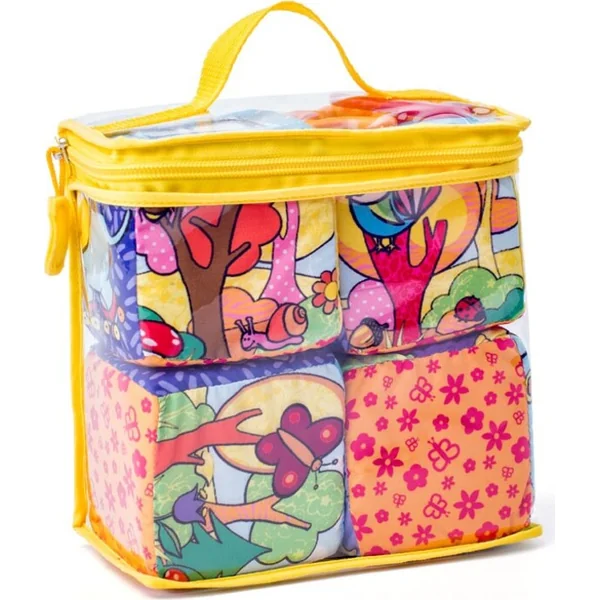 Toutes les cubes en textile contiennent divers éléments de jeu : hochets, anneaux de dentition, sifflets, miroir fabriqué en film de sécurité, dans lequel l’enfant voit son visage et des parties qui produisent le son du papier froissé.