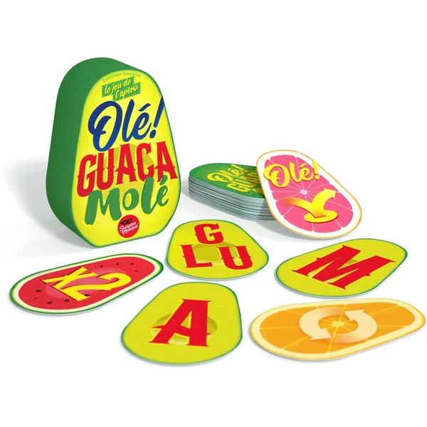 Olé Guacamolé est un jeu d’apéro, simple et rapide, dans lequel vous devez trouver des associations de mots sans utiliser des termes qui possèdent l’une des lettres présentes au centre de la table.