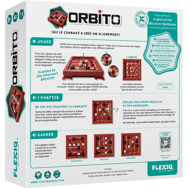 Déplacez une bille adverse, posez l’une des vôtres, puis appuyez sur le bouton. Toutes les billes se déplacent d’une case. Alignez-en 4 pour gagner.