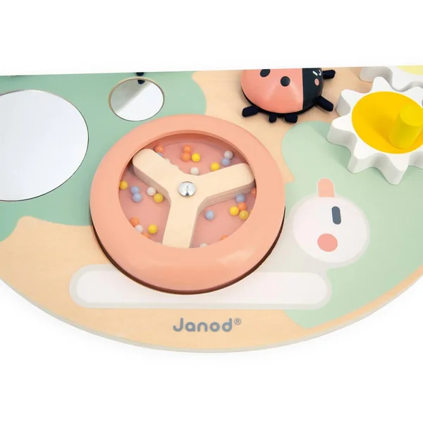 Venez voir, l’abeille est prête à s’envoler, la coccinelle tourne sur elle-même, et la chenille se promène ! Ce beau panneau en bois se compose de nombreux animaux du jardin aux fonctionnalités amusantes. Il possède 7 activités : 3 engrenages en forme de marguerites à faire tourner, 1 boulier, 1 coccinelle qui se visse et se dévisse, 1 abeille qui fait cric-cric quand on la tourne, 1 escargot dont la coquille tourne et fait retentir les perles mulicolores à l’intérieur, et enfin, 3 miroirs dont 1 caché sous la feuille en feutrine. Ce panneau est très pratique et s’adapte à la position de jeu la plus confortable pour l’enfant. Grâce à son pied amovible, le panneau d’activité peut être mis en position à 45° pour permettre à l’enfant de jouer aisément assis ou sur une table. Une fois le pied rangé, le panneau est complètement plat et peut être accroché au mur ou aux barreaux du parc à l’aide du grand scratch sur le dessus. C’est un jouet simple et complet aux couleurs douces qui permettra à votre enfant de développer sa motricité fine et sa dextérité. Jouet en bois FSCTM. Jouet d’éveil pour les enfants à partir de 12 mois.