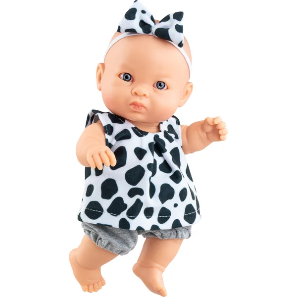 Les Peques Jana poupée en tunique et serre-tête avec un motif noir et blanc et un short gris jusqu’aux genoux.