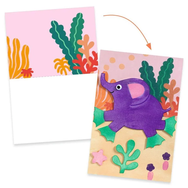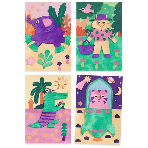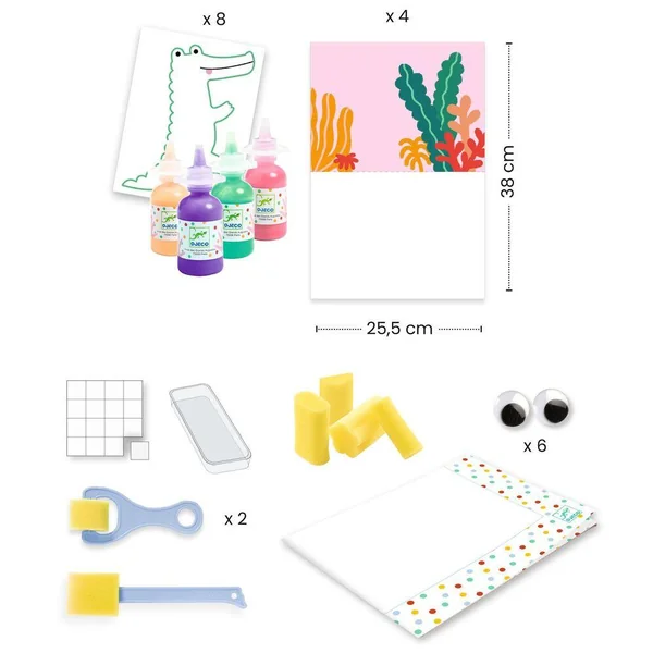 Un grand coffret de peinture sur le thème des animaux en voyage. Après avoir protégé la table avec la nappe, l’enfant peint toutes les pièces en utilisant le pieau-éponge, les rouleaux et les mousses. Une fois les pièces sèches, il place les yeux rigolos mobiles et colle chaque animal dans son grand décor.