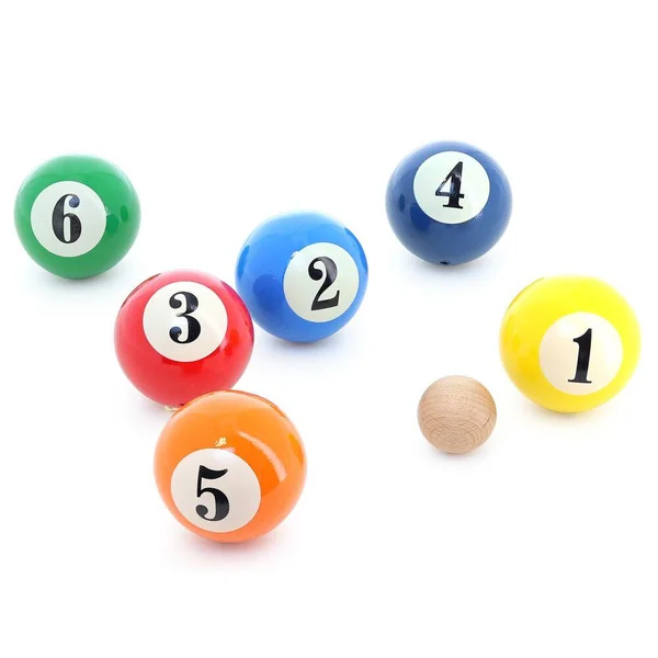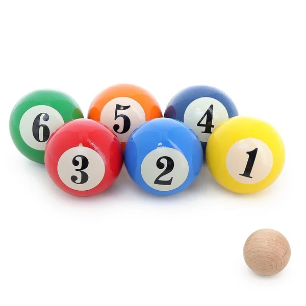 Composé de 6 boules en bois massif laqué numérotées de 1 à 6, il s’inspire du style des boules de billard avec leurs couleurs vives et leur finition brillante.