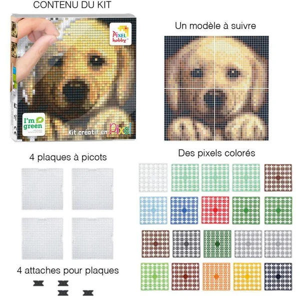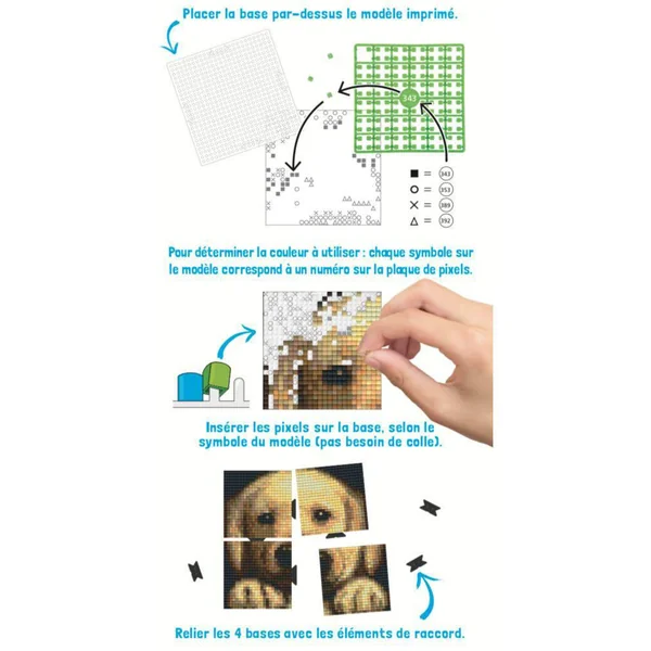 Tableau au numéro tout en pixel : Insérer les pixels sur la base en suivant le code couleur fourni,pour créer le dessin.Pas besoin de colle ni de fer à repasser, la fixation est instantanée ! CONTENU DU KIT :20 couleurs de pixel – 140 carrés de pixel par couleur, 1 modèle à diviser en 4, 4 attaches pour reconstituer le tableau, 4 bases à picots 3x3cm