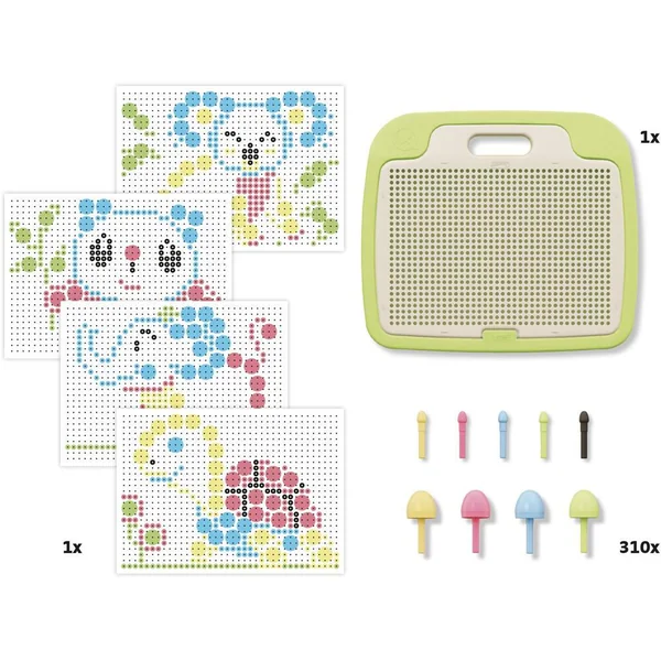 Nouveau design avec son panier et sa tablette pour tout ranger. 4 cartes à motifs à recopier sont incluses à l’intérieur.