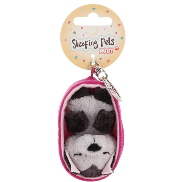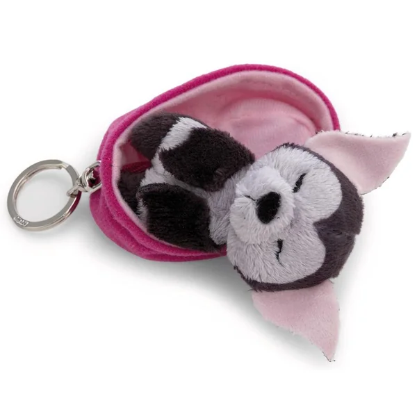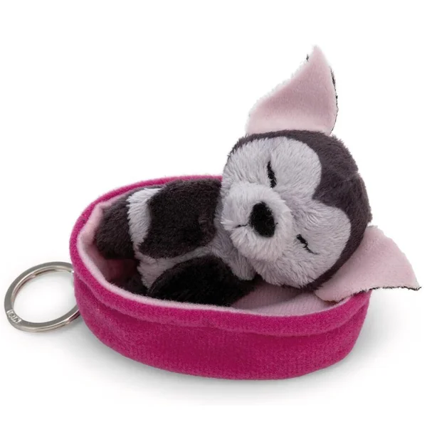 Porte-clés bébé chauve-souris endormie suspendue dans son panier rose vif. Accessoire original et ultra doux.