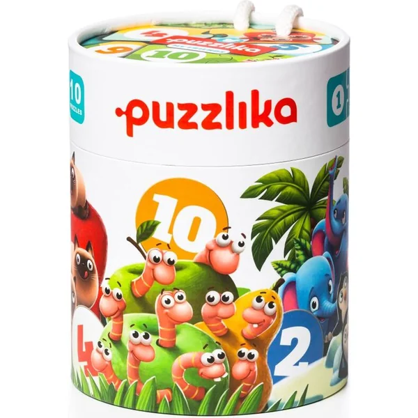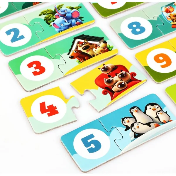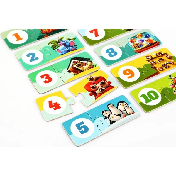 Dans la boîte, vous trouverez 20 grands puzzles solides, formant 10 paires de cartes distinctes qui sont thématiquement liées. Sur une moitié des cartes, il y a des illustrations d’animaux en nombre donné et sur l’autre moitié des cartes, leur nombre est représenté par un chiffre.