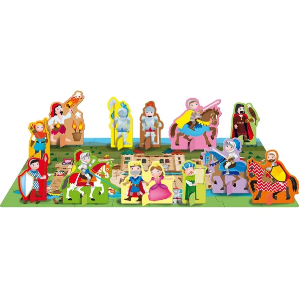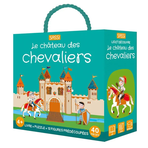 Une boîte aux détails irisés contenant un livre de 10 pages, un puzzle de 40 pièces et 12 figurines en forme à assembler et à placer sur le puzzle, pour apprendre à reconnaître et à associer des éléments et des mots.