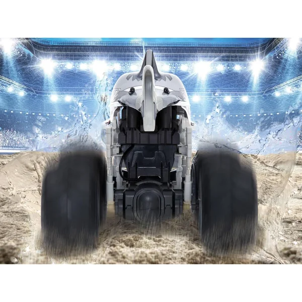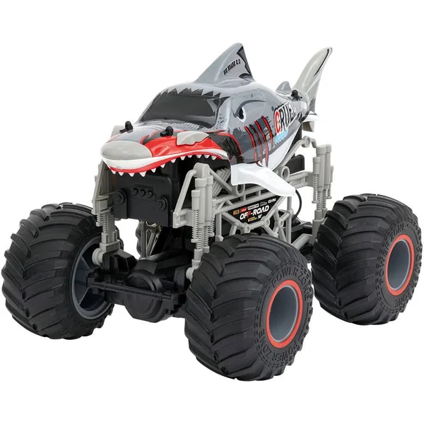 RC Monster Truck à l’échelle 1:16è, 2 voies, 2,4GHz pour jouer à plusieurs sans interférences. Avec ses énormes pneus et son design de requin exceptionnel, il attire tous les regards. Sa télécommande convient aux droitiers et aux gauchers. Batterie Li-Ion 7,4 V amovible et rechargeable via chargeur USB fourni. . Vitesse : 15 km/h. Longueur du modèle : 325 mm. Nécessite 2 piles 1,5 V AA, non fournies. À partir de 8 ans.