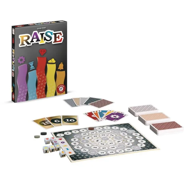 Un jeu de bluff et enchères. BUT DU JEU : Gagner le plus de points en misant sur les bonnes cartes au bon moment. MECANIQUE DU JEU : La devise de Raise : surenchéris ! Chaque joueur a 30 cartes identiques… A toi de les jouer habilement, en fonction du résultat des dés et de l’importance de chaque manche pour finir en tête. Lequel d’entre vous risquera tout au bon moment ? LA REGLE EN BREF : Tout le monde pioche 6 cartes. Le premier joueur retourne la première carte de points, lance les dés et les place aux emplacements appropriés à côté du plateau de jeu, triés par symbole. Chaque joueur choisit simultanément et secrètement une carte de sa main et la place face cachée devant soi. Ensuite, toutes les cartes sont révélées en même temps. Calcule ton score en multipliant la valeur de ta carte par le nombre de symboles sur les dés. Avance ton jeton d’autant de cases sur le plateau. Le joueur dont le jeton est le dernier doit décider en premier s’il continue ou s’il passe. S’il continue, il devra jouer autant de cartes que nécessaire pour doubler un autre joueur. S’il passe, il retire son jeton du plateau et la manche s’arrête pour lui.Le dernier joueur à avoir son jeton sur le plateau emporte tous les points de la manche ! Quand toutes les cartes points sont épuisées, la partie s’arrête. Le joueur qui a le plus de points remporte la partie.
