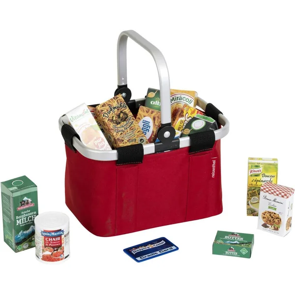 Panier de courses de Reisenthel « carrybag mini » rouge, garni. Design original par Reisenthel. Tissu résistant en polyester. Cadre en aluminium pour plus de légèreté. Bonne stabilité grâce aux renforts latéraux. Poignée rabattable. Livré avec de nombreuses boîtes d’aliments factices.