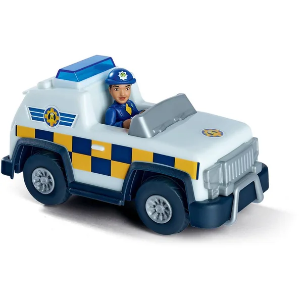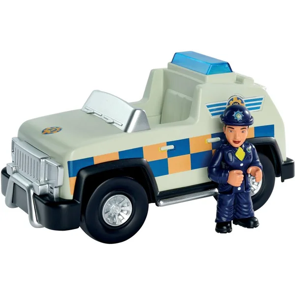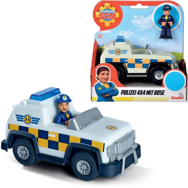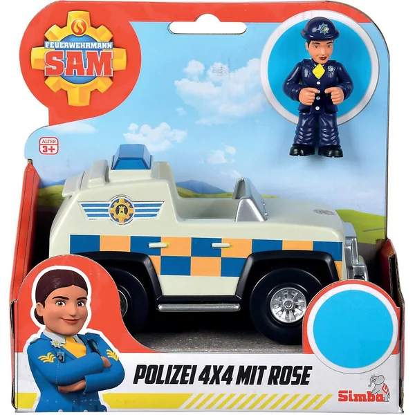 Mini véhicule 17cm Sam le Pompier représentant le 4×4 de police. 1 figurine articulée représentant Rose incluse.
