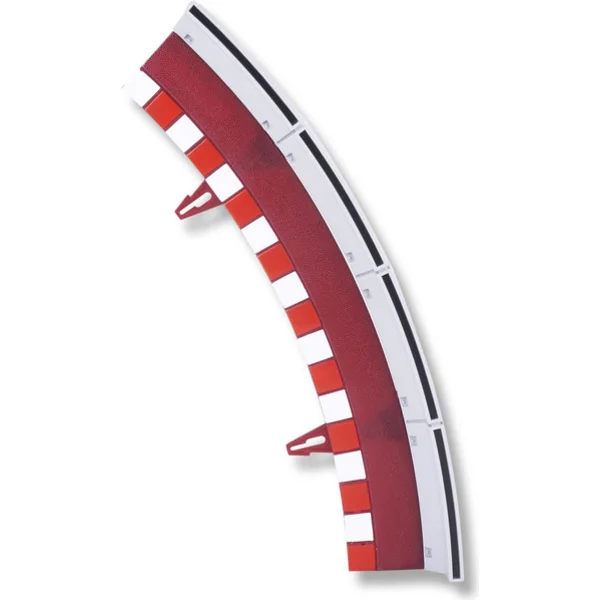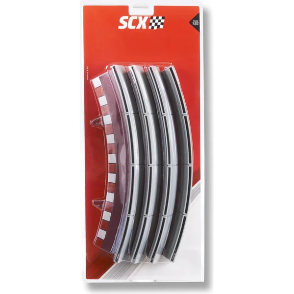 Éléments de bordure avec barrières pour la piste de course standard SCX 1:32. L’emballage contient 4 pièces de bordure avec barrières.