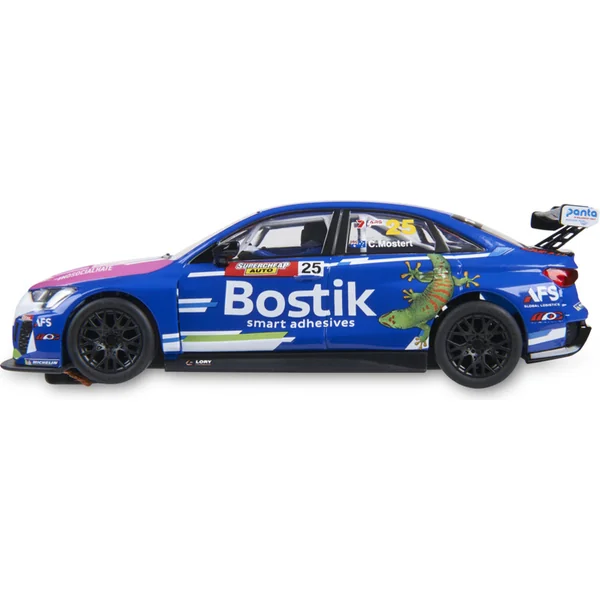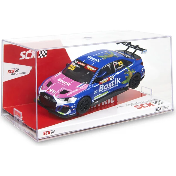 Voiture de circuit SCX Original Audi RS3 LMS TCR Bostik à l’échelle 1:32, pour circuits analogiques SCX Original. La voiture est équipée de lumières LED.