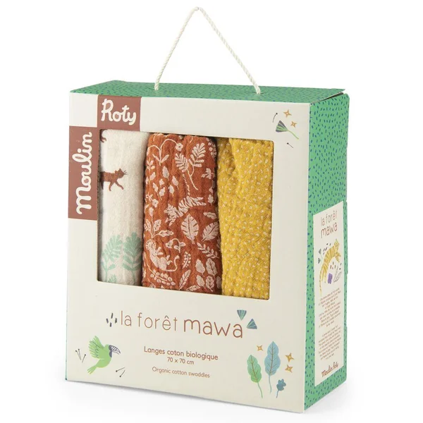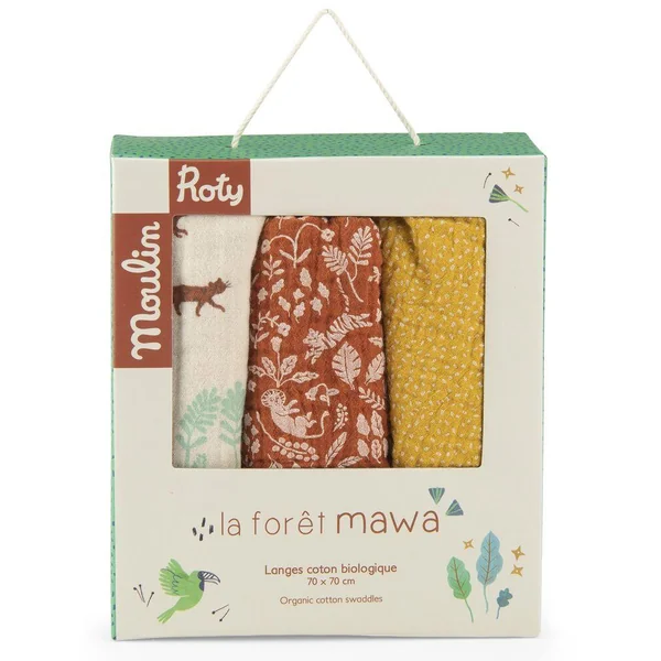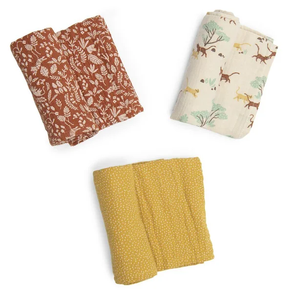 Set de 3 langes souples et légers pour changer bébé ou l’envelopper de douceur pendant les balades. 3 imprimés issus de la collection : félins, feuillage et confettis. Personnalisables au prénom de l’enfant. Labelisé OEKO-TEX® STANDARD 100 – CQ1337/1 IFTH