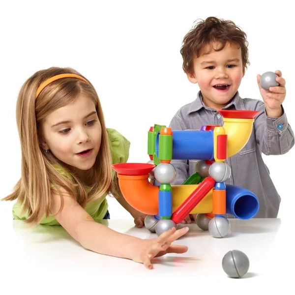 - Ce set comprend 2 longues barres, 8 barres de longueur moyenne, 3 tubes courbés, 2 tubes droits, 2 entonnoirs, 9 billes métalliques et 4 panneaux avec des trous.