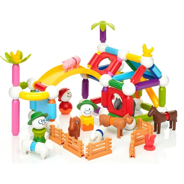 Le set comprend 9 animaux magnétiques, 3 fermiers et des pièces de construction, avec lesquelles vous pouvez construire une nouvelle ferme à chaque fois.