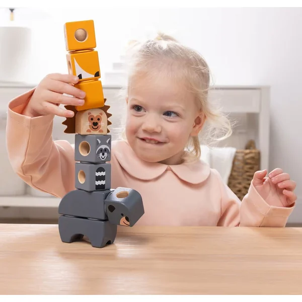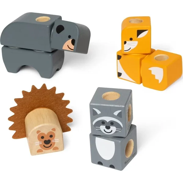 Le mode d’emploi illustré montre comment assembler des animaux de la forêt avec différentes textures à partir des Blockables™ – un raton laveur, un ours, un renard et un porc-épic avec des piquants en feutre. Les enfants peuvent également combiner librement les différentes pièces et créer leurs propres personnages selon leur imagination.