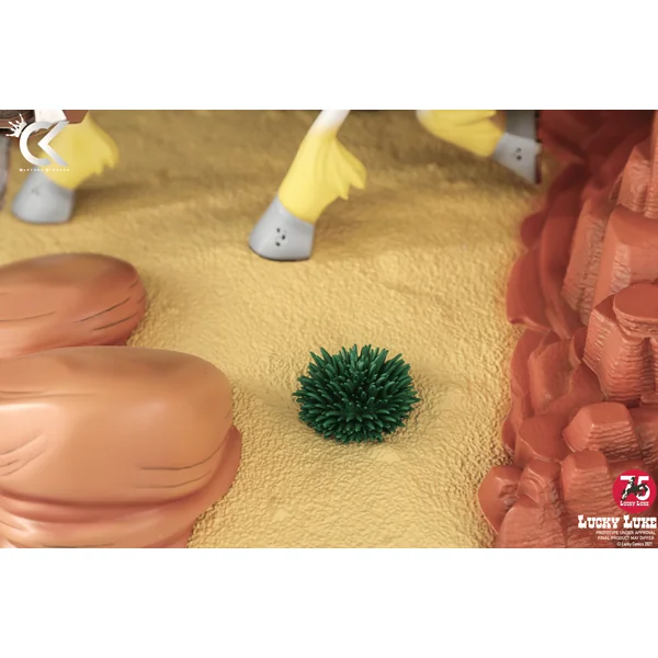 La statuette met en scène le cow-boy solitaire Lucky Luke sur le dos de son fidèle ami Jolly Jumper.