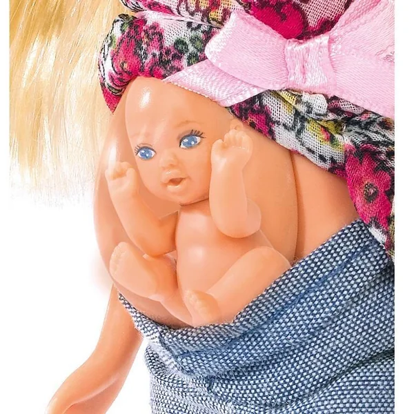 Steffi est enceinte; elle a un bébé dans le ventre. Le bébé sort du ventre (amovible) de la poupée. Avec 10 accessoires inclus pour s’occuper du bébé.