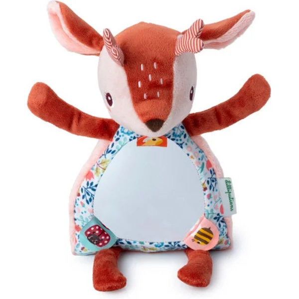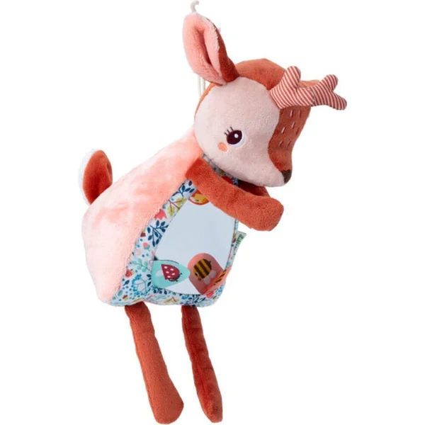 Stella, le faon, dispose de mains aimantées qui lui permettent de se cacher les yeux lorsqu’il joue à cache-cache avec l’enfant, suscitant ainsi rires et admiration. Un grand miroir placé sur son abdomen incite l’enfant à explorer son reflet, favorisant ainsi son développement sensoriel et sa connaissance de soi. Trois étiquettes se trouvent sur le miroir, chacune dissimulant des dessins cachés à dénicher en les levant.