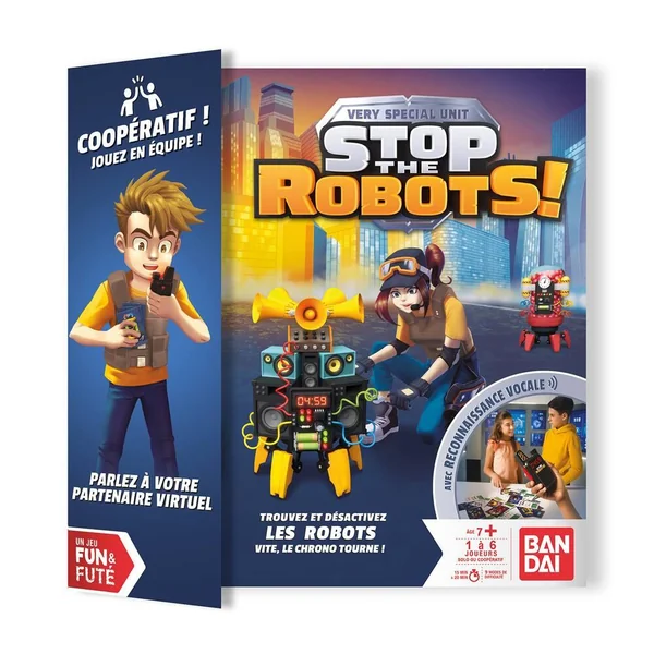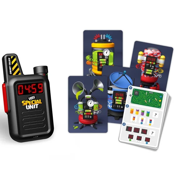 Un scientifique fou menace la ville avec des robots fous ! Pour lutter contre cette menace, une seule solution : La very special unit. Parle à ton partenaire grâce au talkie walkie à reconnaissance vocale. Il va te donner les informations pour identifier le robot ! A toi de résoudre les énigmes et le désactiver. Attention le temps presse ! 36 missions folles avec plus de 100 énigmes de différents niveaux, 1 à 6 joueurs (mode solo ou coopératif) Inclus 1 talkie walkie + 36 cartes + notice.