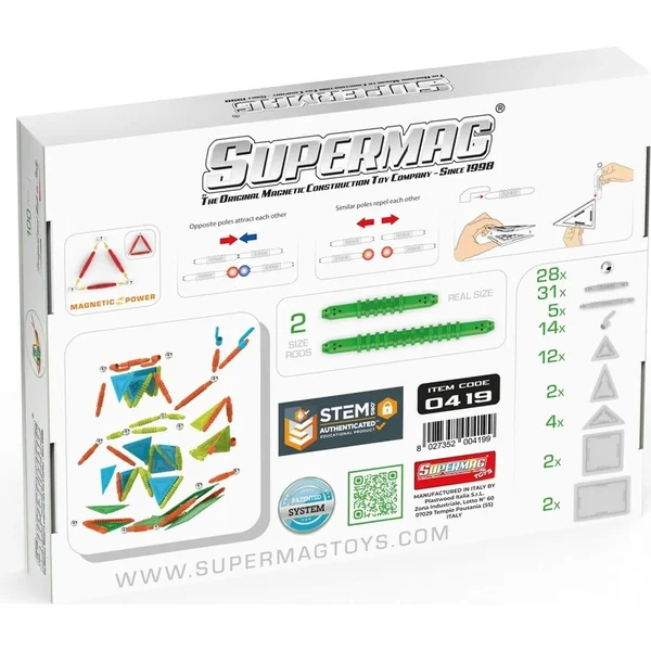 SUPERMAG est un kit de construction magnétique premium qui combine tous les points forts d’un système breveté en une ligne unique et inimitable. Il permet de créer un nombre incalculable de constructions qui peuvent être étendues, démontées et remontées – avec la précision et la technicité d’un véritable projet. Les jouets Supermag ne sont pas seulement des jouets ; ce sont des outils éducatifs qui soutiennent l’éducation STEM (Science, Technologie, Ingénierie et Mathématiques). En jouant avec les jouets Supermag, les enfants développent leur pensée critique, améliorent leur compréhension des concepts scientifiques et découvrent les principes d’ingénierie à travers le jeu pratique.