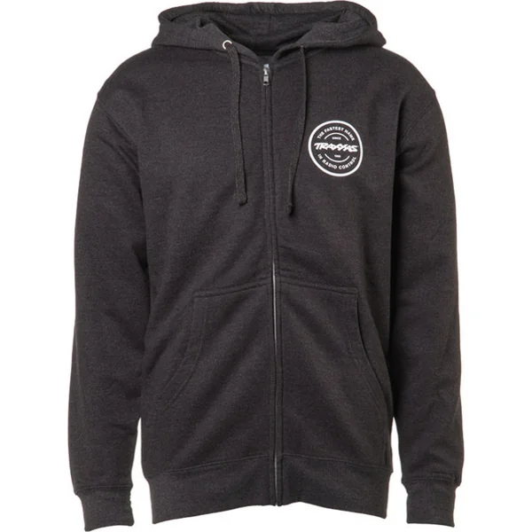 Haut à capuche zippé pour adultes Traxxas avec graphique de jeton TRAXXAS en noir. Taille XL. Matériau 100% coton. Coupe standard.