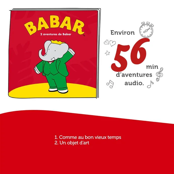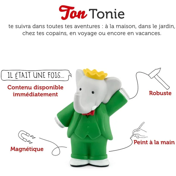 Avec votre figurine TONIES® Babar et votre TONIES®box (vendue séparément), Accompagnez Babar, le roi des éléphants, dans deux palpitantes chasses au trésor.