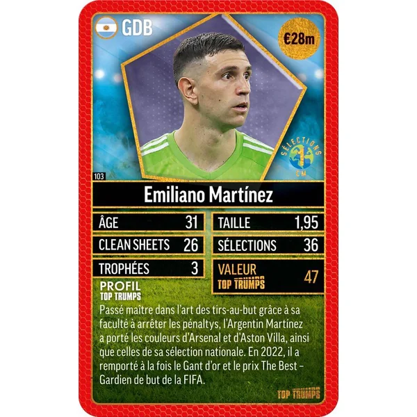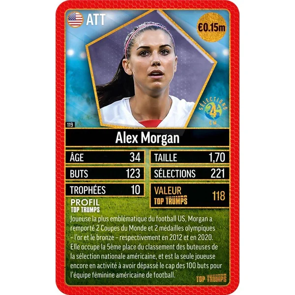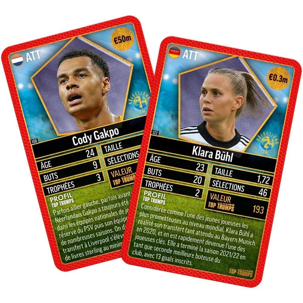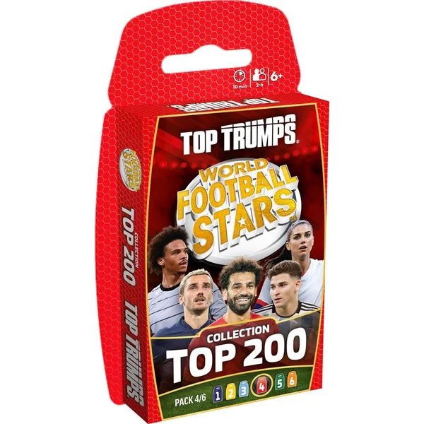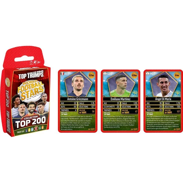 Entrez sur le terrain de jeu avec Top Trumps World Football Stars Top 200 ! Collectionnez les meilleurs joueurs de foot des plus grandes ligues mondiales : Angleterre, France, Italie, États-Unis, Allemagne, Espagne, et Moyen-Orient. Hommes et femmes, 33 des meilleurs joueurs et joueuses sont réunis dans ce quatrième pack. Collectionnez les 6 pack World Football Stars Top 200 pour obtenir la collection complète. Qui a le plus de trophées entre Julián Álvarez et Leroy Sané ? Qui vaut le plus : Alex Morgan ou Antoine Griezmann ? Comparez les statistiques, apprenez des faits surprenants et défiez vos amis pour découvrir qui possède la meilleure carte.