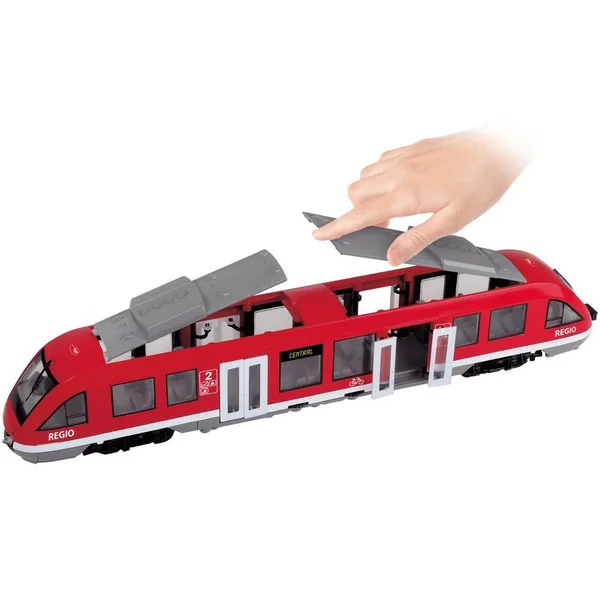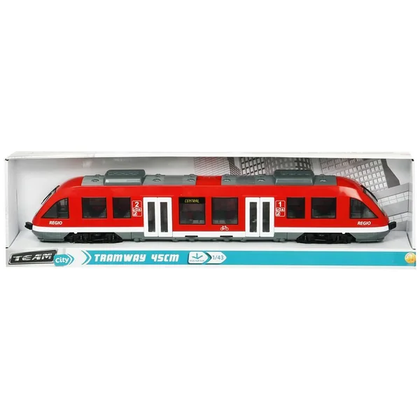 Tramway en plastique à roues libres avec portes et toit ouvrants décoré à l’intérieur. Echelle 1/43ème.