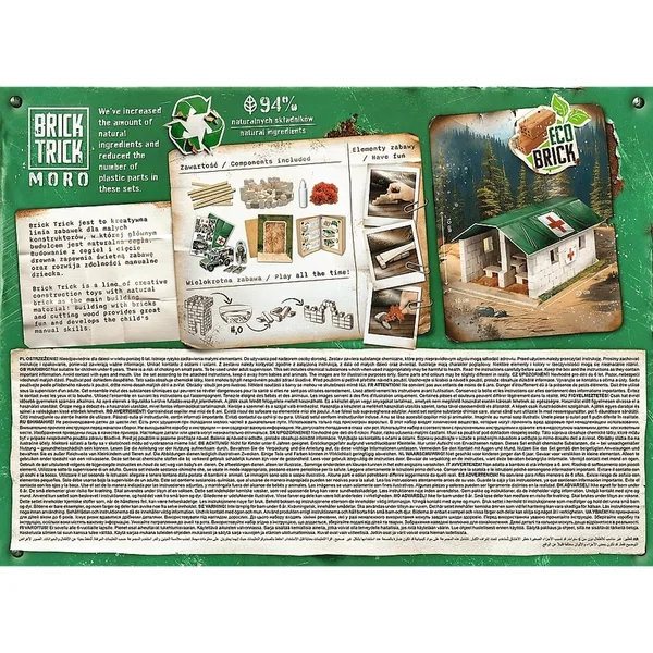 Brick Trick Moro est une série de kits de construction incroyables qui vous plongera dans un monde d’aventures militaires et de missions de sauvetage. Nous tenons à l’environnement, c’est pourquoi le kit de blocs en céramique Hôpital de campagne contient jusqu’à 94 % d’ingrédients naturels ! Les blocs EKO garantissent du plaisir !
