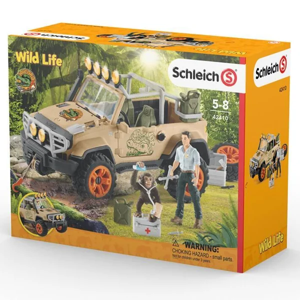 Comprend un 4×4 avec son treuil de 40 cm, 1 personnage le ranger David, 1 chimpanzé et de nombreux accessoires.