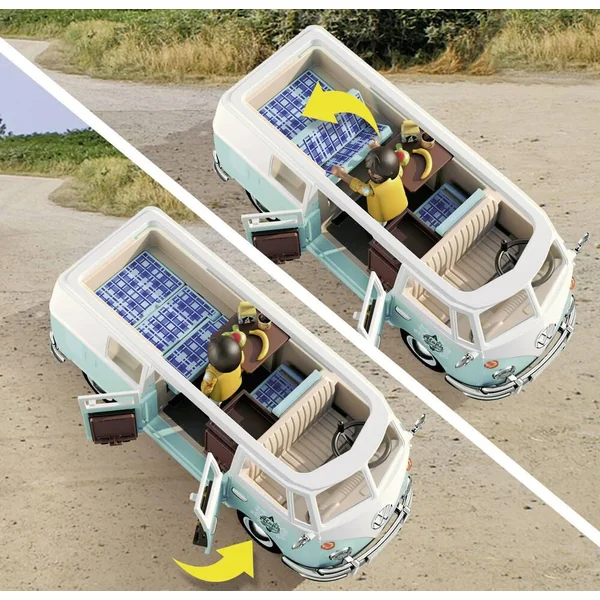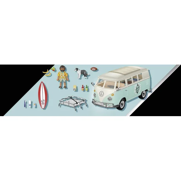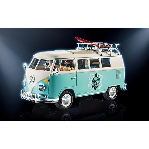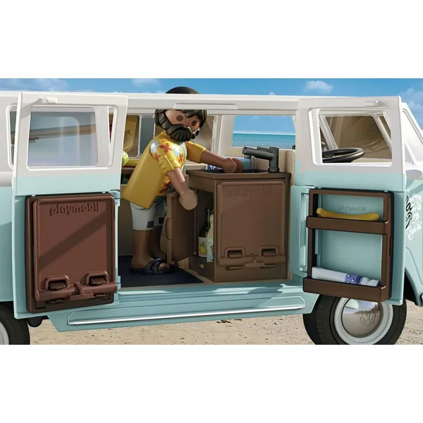 L’aspect multicolore et les accessoires chromés donnent une allure moderne à cette star des années 60. La voiture dispose d’un toit amovible et d’un intérieur réaliste. Les banquettes peuvent se transformer en espace de couchage pour deux. Les portes latérales s’ouvrent et disposent d’un espace de rangement pour les accessoires de bain. Le kit comprend également une figurine Playmobil, une planche de surf, un chien border collie, une banane, une pomme, une brosse à dents et d’autres accessoires adorables.