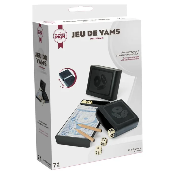 Pour jouer aux dés, même en voyage ! Ce Yams de voyage est pratique à transporter et facile à ranger. Il est parfait pour les vacances mais aussi pour la vie de tous les jours. But du jeu : chaque joueur doit réaliser la meilleure combinaison avec les 5 dés en 3 lancée maximum. Facile à transporter grâce à sa boîte de rangement. Notice incluse. De 2 à 4 joueurs. Inclus : 1 boîte de rangement en plastique dont les 2 lanceurs permettent de refermer la boîte, 5 dés en plastique, 2 crayons à papier et des feuilles de scores.